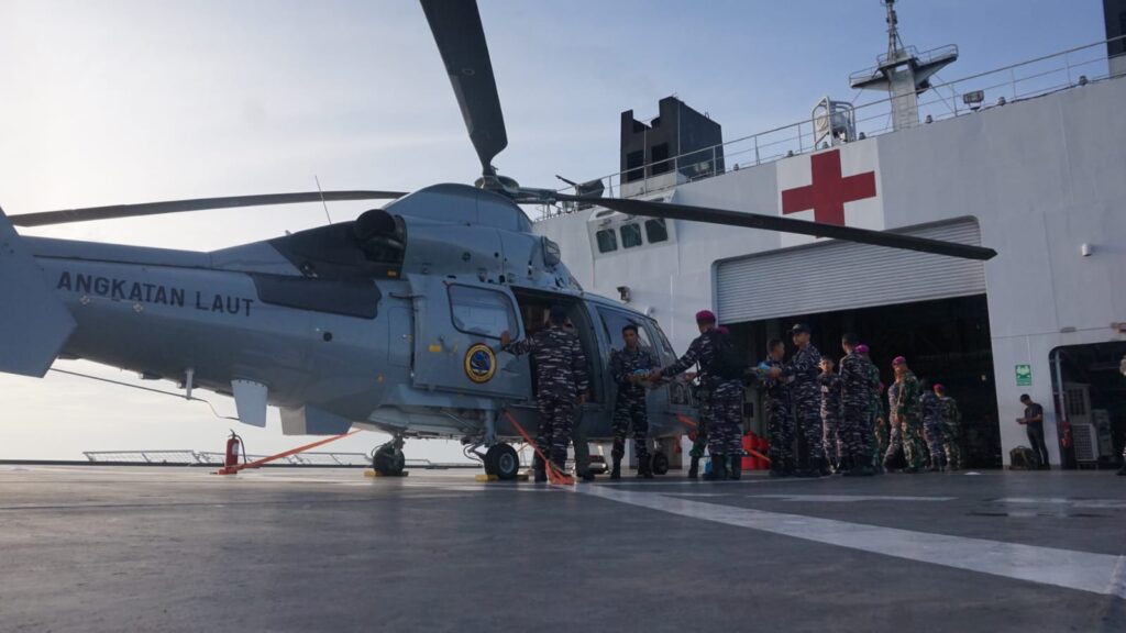 KRI dr. Soeharso-990 yang berada di bawah Satuan Kapal Bantu (Satban) Koarmada II melaksanakan embarkasi ke Heli Panther HS-1302 sebagai bagian dari operasi pendistribusian bantuan bagi warga Desa Marlempang di Kabupaten Aceh Tamiang yang terdampak bencana alam pada Rabu (11/12).