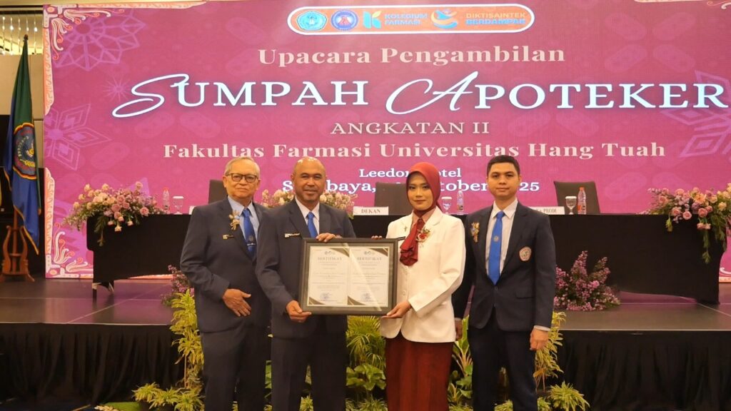 Surabaya, 28 Oktober 2025 — Fakultas Farmasi Universitas Hang Tuah (UHT) kembali menorehkan prestasi membanggakan dengan menyelenggarakan upacara Sumpah Apoteker Angkatan ke-2 yang berlangsung di Hotel Leedon, Surabaya. Acara ini menandai kelulusan 30 mahasiswa profesi apoteker dengan tingkat kelulusan 100 persen pada Ujian Kompetensi Mahasiswa Pendidikan Profesi Apoteker Indonesia (UKMPPAI).