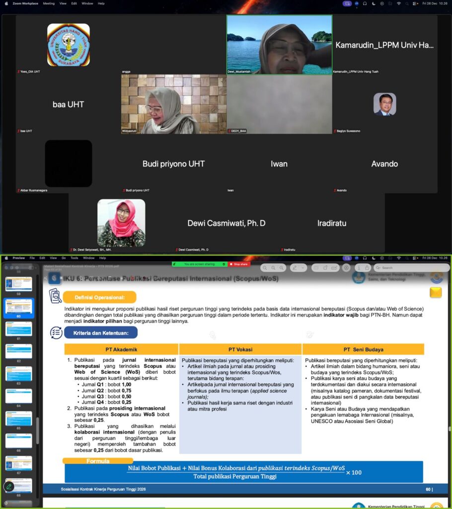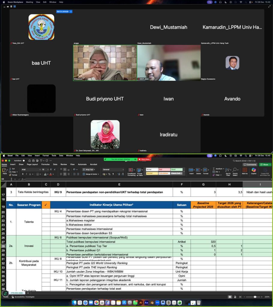 Saat ini, UHT tengah menyusun Arah Kinerja Perguruan Tinggi Tahun 2026 yang mencakup 6 IKU Wajib dan 2 IKU Pilihan, sesuai Kontrak Kinerja Perguruan Tinggi 2026. Seluruh dokumen kinerja tersebut wajib diunggah paling lambat 29 Desember 2025.
